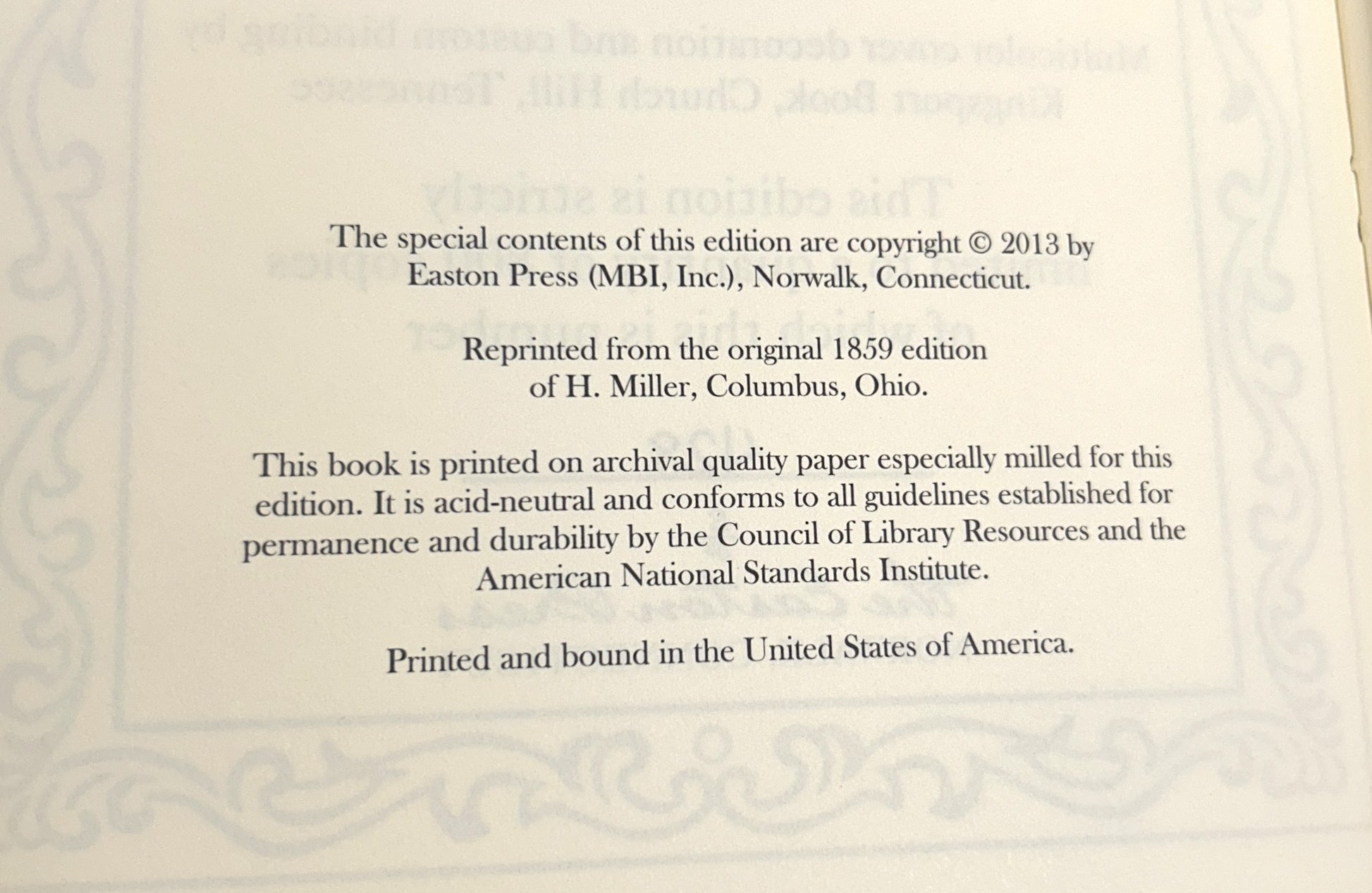 Very good Easton Press hardcover book, no dust jacket (as issued); book is full leather with raised bands on the spine and all edges gilt showing very light wear to the gilt (see photos) and lightly bumped corners (see photos) but otherwise showing only light additional evidence of having been previously read; purchaser signature may be required upon delivery. G2