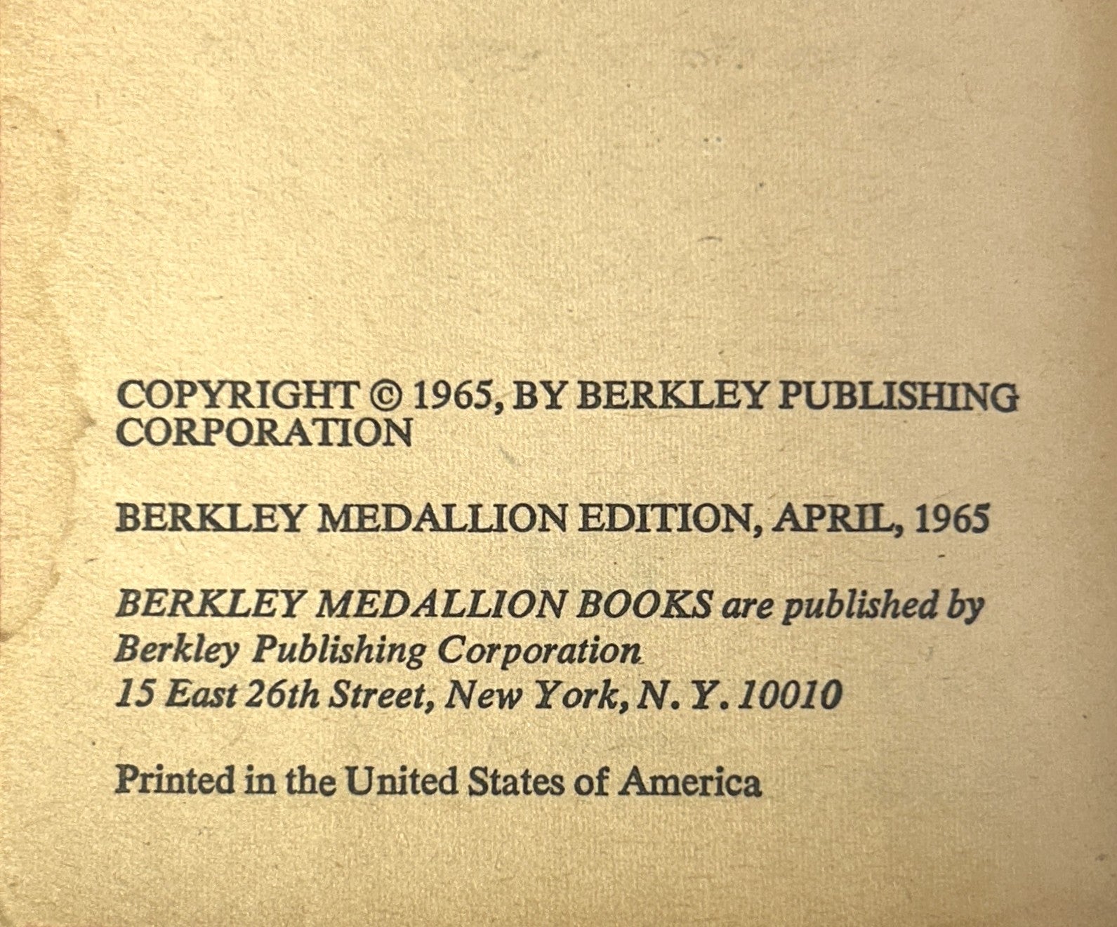 Good mass market paperback book; the book is clean, tight, square, and -- but for a stamp on the reverse of the front cover (see photos) --- free of any markings showing well thumbed and age-toned pages (see photos) and damp stains to the first several pages (see photos) but otherwise showing only light additional wear; book cover (wrap) shows moderate shelf wear, including age-toning (see photos), creasing to both front and back covers (see photos), creasing and bumping to the corners (see photos), wear along all edges (see photos), and creasing along the spine (see photos) but remains in good, vintage, condition. J4