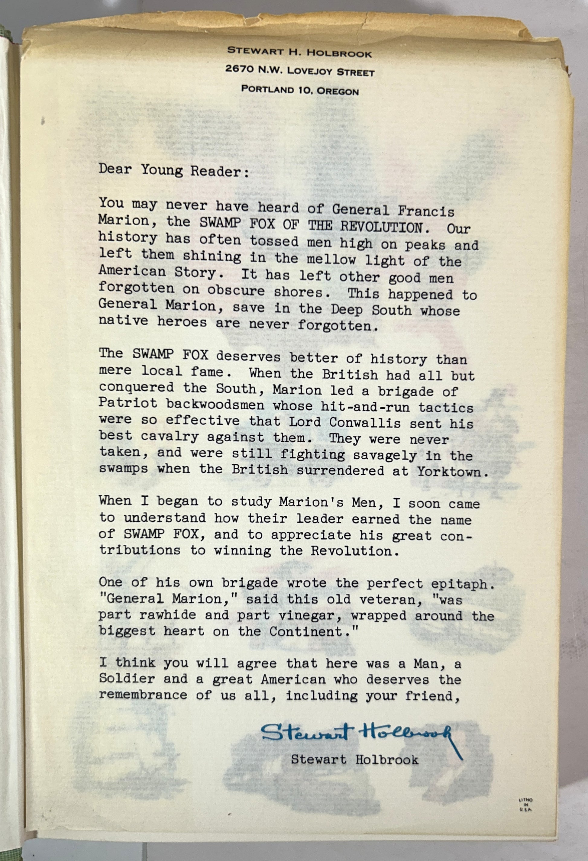 Landmark #90: Swamp Fox of the Revolution by Stewart Holbrook 1959 SIGNED Letter