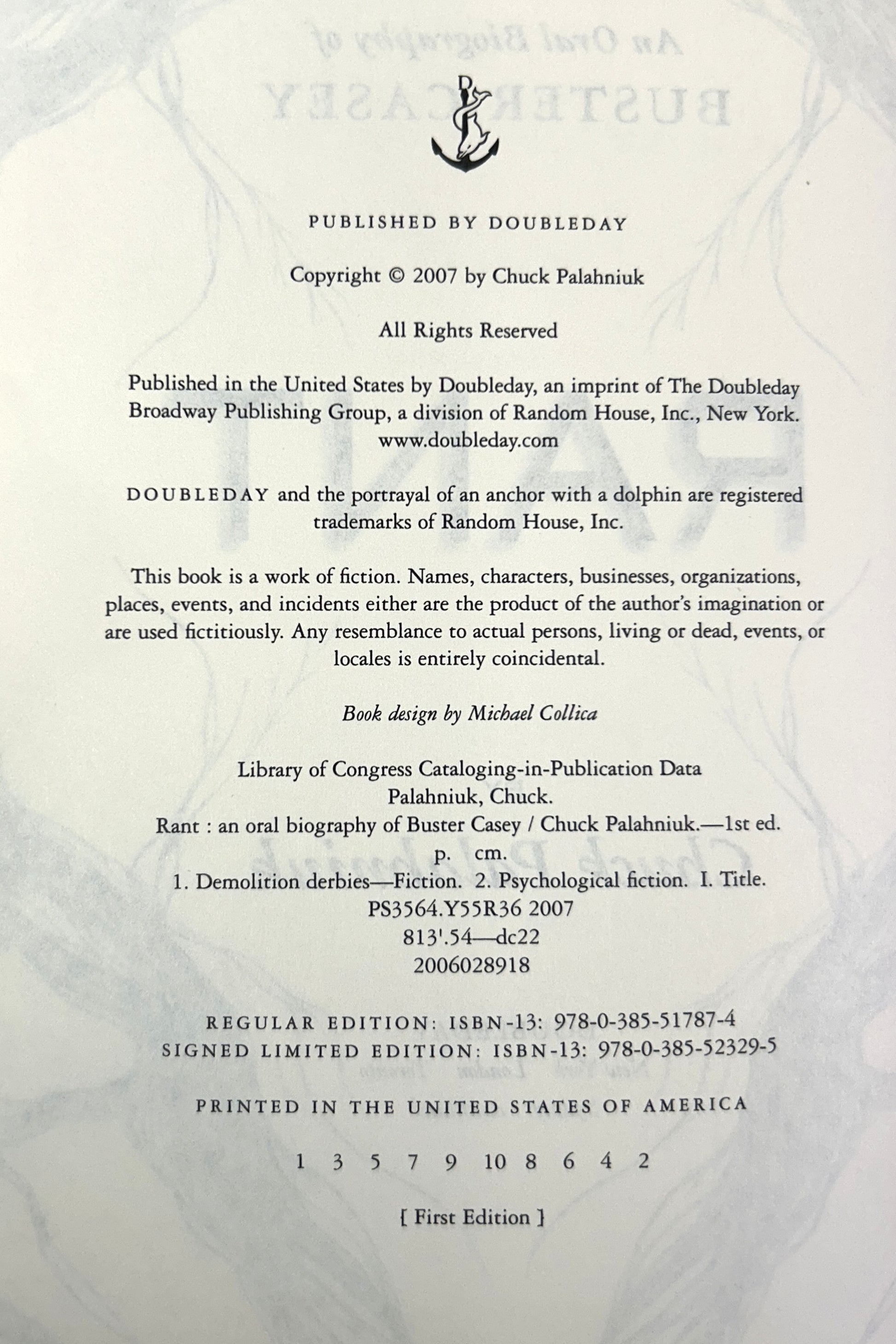 Rant: An Oral Biography of Buster Casey by Chuck Palahniuk 2007 SIGNED 1st Edition