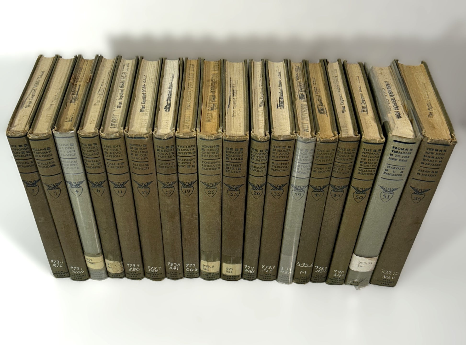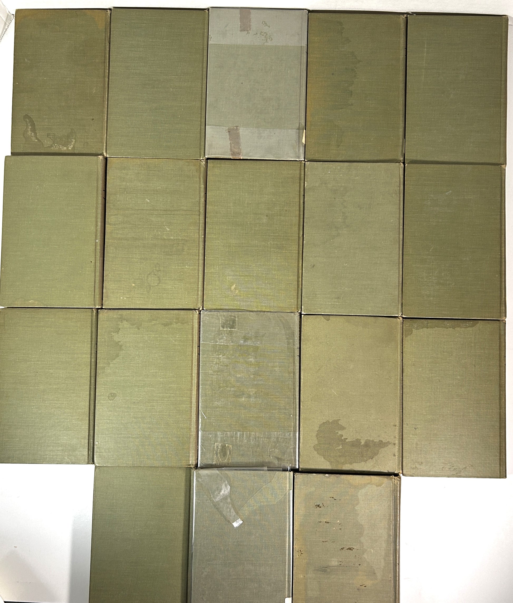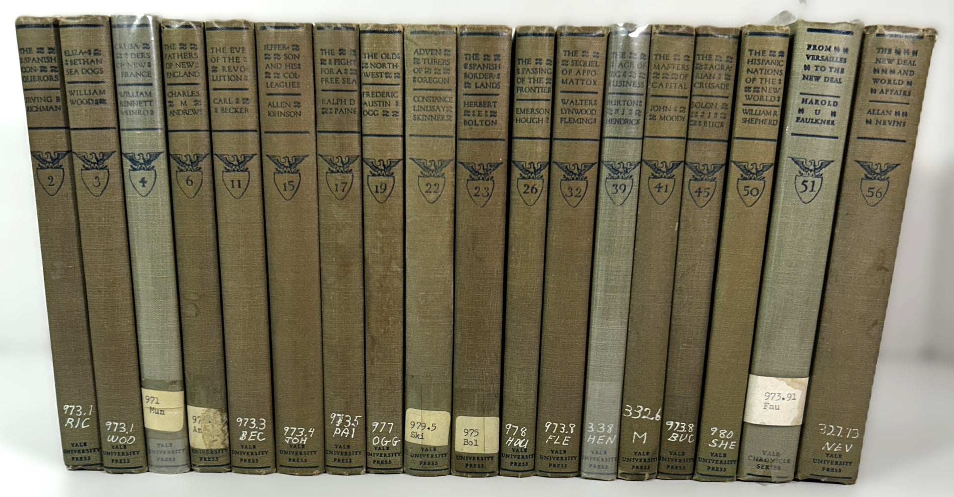 Set of 18 acceptable, vintage, ex-library, hardcover books; each book is clean and square showing all stickers, stamps, and markings associated with an ex-library (see photos) and well to heavily thumbed and age-toned pages (see photos); boards show heavy shelf and corner wear, including all stamps, stickers, and markings associated with an ex-library (see photos), heavy age-toning and sunning along the spines (see photos), rubbing and bumping along all board edges and to the corners (see photos), heavy discoloration and staining to several faces (see photos), and fraying/bumping to the head and foot of each spine (see photos) but overall remain in acceptable, vintage, condition; published circa 1950s by Yale University Press; please thoroughly review all photos prior to purchase for a comprehensive understanding of the condition of this collection; purchaser signature may be required upon delivery. H5