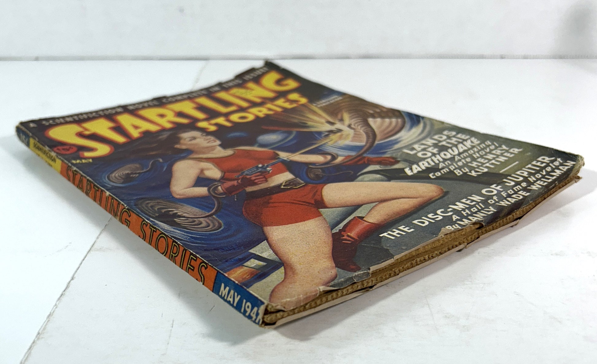 Good, vintage, softcover, pulp magazine; the magazine is tight, square, and showing heavily thumbed and age-toned pages (see photos); magazine cover (wrap) shows moderate shelf wear, including significant age-toning (see photos), markings to the front cover (see photos), chipping along all edges and corners (see photos), creasing to the corners (see photos), and chipping to the head and foot of the spine (see photos) but remains in good, vintage, condition; includes Manly Wade Wellman story. A1