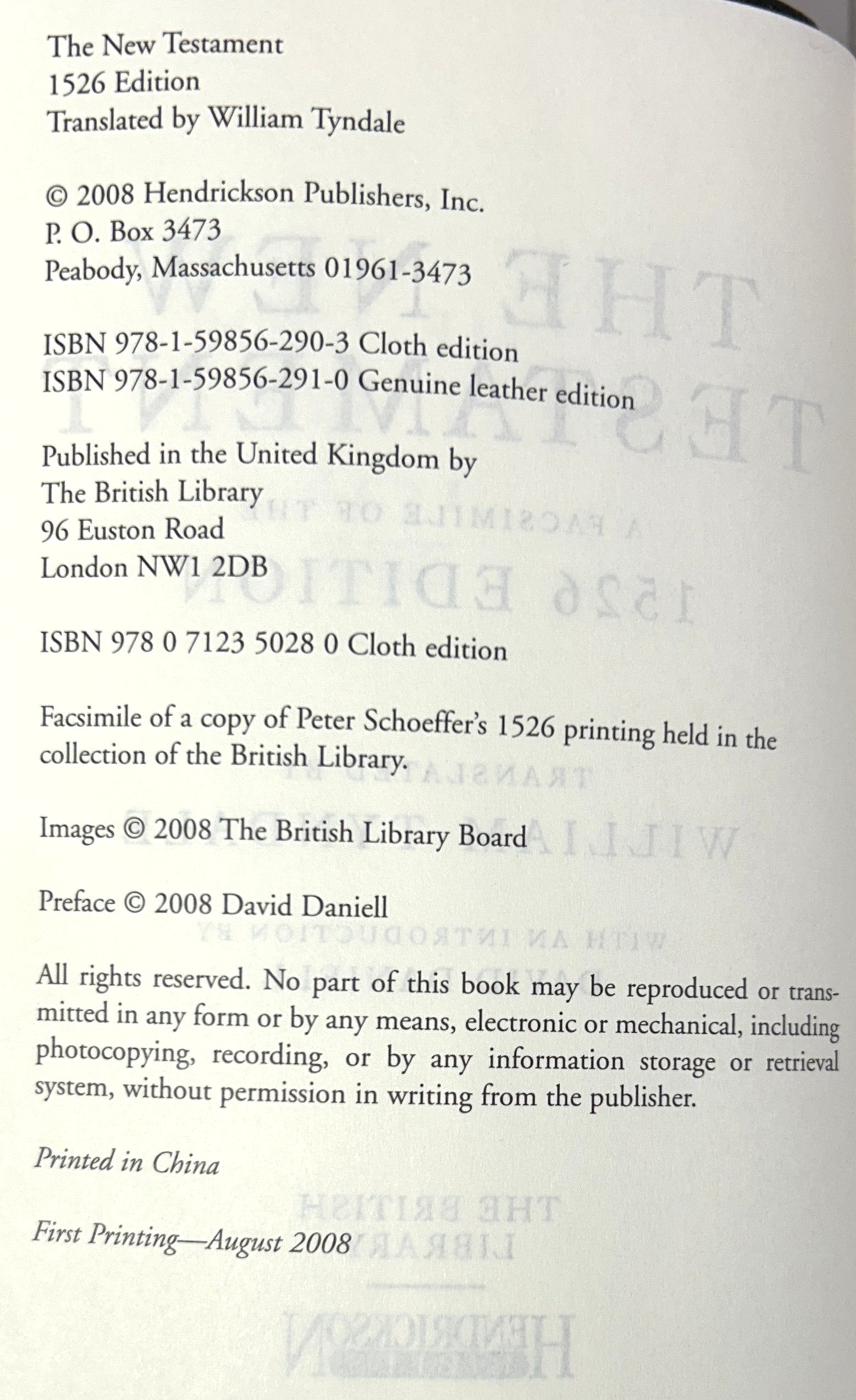 The New Testament 1526 Edition translated by William Tyndale 2008 in Box